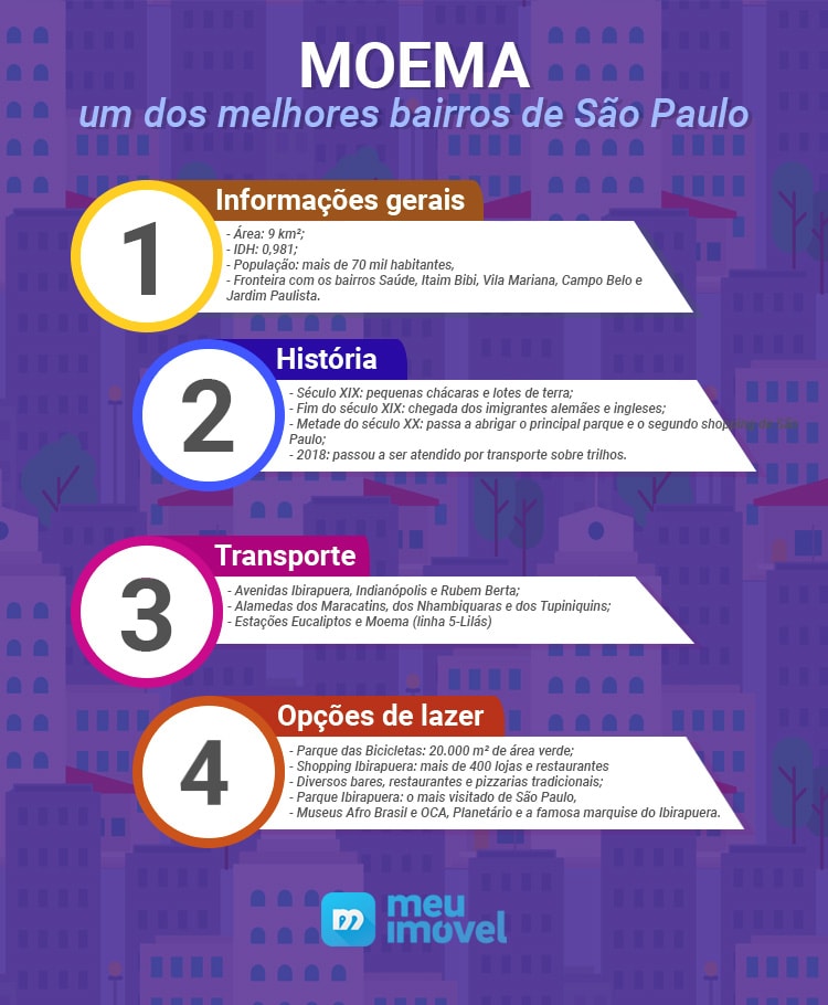 No século XIX, Moema era habitada principalmente por imigrantes alemães e ingleses instalados em chácaras e pequenos lotes de terra. Mesmo hoje tendo uma população de mais de 70 mil habitantes e uma área de 9 km², o bairro demorou para se desenvolver e se tornar um importante distrito da capital.