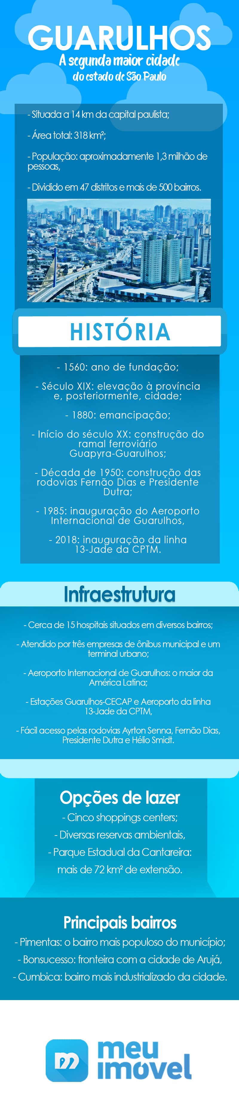 Guarulhos é considerada a segunda cidade com o maior número de habitantes do estado de São Paulo e está situada a 14 km da capital paulista. Em sua área total de mais de 318 km², cerca de 1,3 milhão de pessoas ocupam seus 47 distritos que, juntos, abrigam mais de 500 bairros.